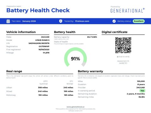 OU70WHP. The Jaguar I-PACE is a fully electric four wheel drive SUV offering a high level of standard equipment and a practical layout. This I-PACE 400 90kWh S Auto offers longer range, with battery health independently tested at 91 percent. Electric vehicle batteries typically see average degradation of around 1.5 to 2.5 percent per year, which places this result well above average for the age and mileage of the car as excellent. A larger boot adds further usability, making this I-PACE suitable for everyday driving as well as longer journeys. The battery also benefits from over two years of Jaguar manufacturer battery warranty remaining or over 50,000 miles, whichever comes first. Cruise Control with Speed Limiter supports motorway driving, while JaguarDrive Control allows the driving mode to be selected to suit conditions. Lane Keep Assist provides steering support if lane markings are crossed. Parking is well covered with Front and Rear Parking Aid, Park Assist, a Rear Camera, and a 360 Degree Surround Camera. Hill Launch Assist and Emergency Brake Assist are also included. Inside, the cabin is finished with Full Leather Upholstery. Heated Steering Wheel and Heated Windscreen are fitted. The 10 inch Touch Pro system includes Navigation Pro, Apple CarPlay, and Android Auto. Bluetooth and DAB Radio handle calls and audio, with the Meridian Sound System fitted. Two Zone Climate Control manages cabin temperature. Keyless Entry, Electric Parking Brake, and multiple 12V Power Sockets complete the interior. This car has just been serviced and comes with a Good Service History, a new 12-month MOT with no advisories, a clear HPI report and verified mileage for peace of mind. Finance is available, and we can provide a personalised video on request. Please note that some features (e.g., Navigation/CarPlay) may require an active subscription. Spec details can vary, so just ask if you’d like us to confirm anything. For more info or a finance quote, call ☎️ 0113 257 00 00.